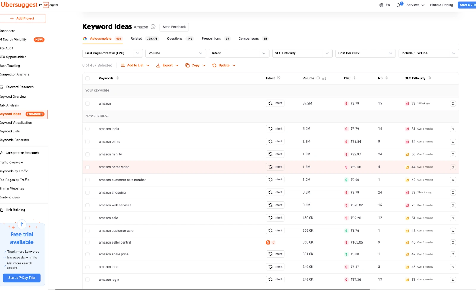 By contrast, when I searched for 'Amazon' in Uber suggest, the tool returned detailed keyword suggestions with clear volume metrics. The interface showed "Amazon" with 37.2M monthly searches, followed by related terms like "Amazon deals," "Amazon Prime," and "Amazon login" with varying search volumes and difficulty scores.